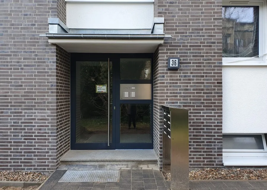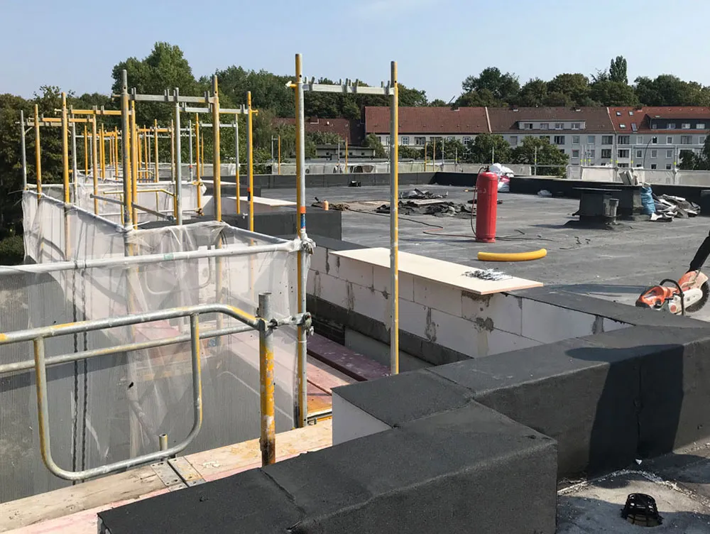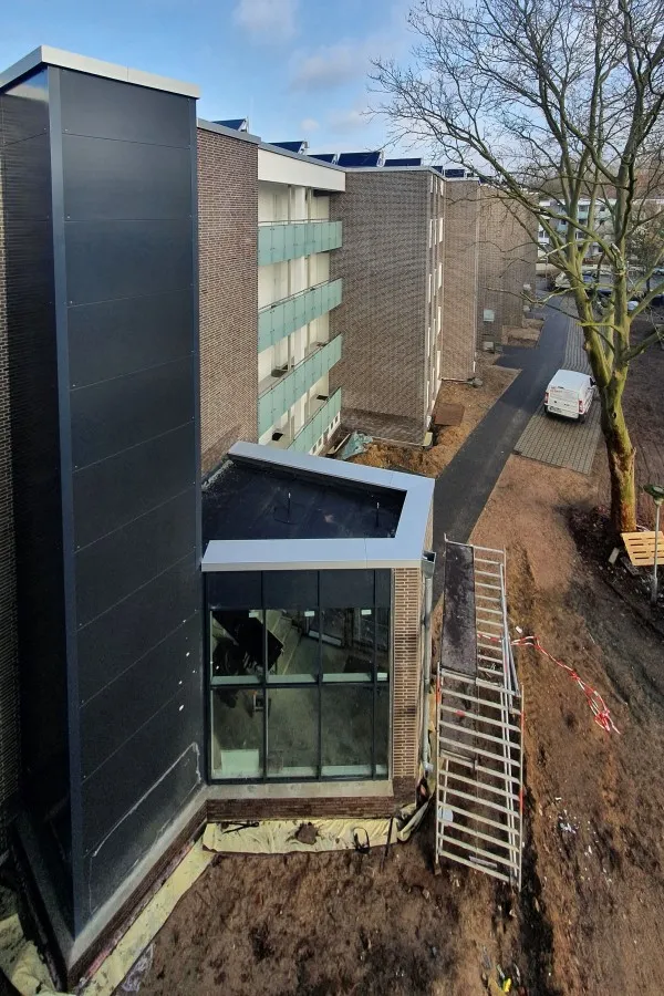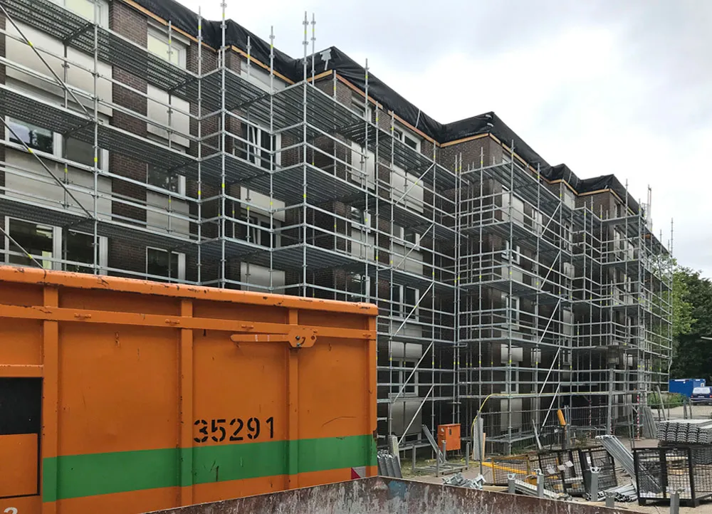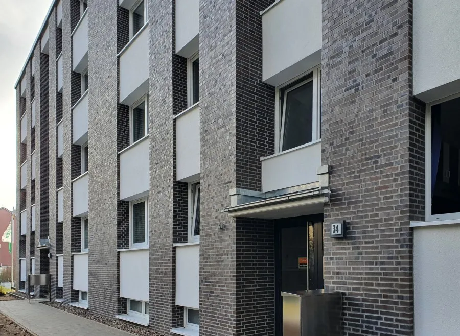 Die materielle Struktur des Klinkers wird durch die Wahl eines Wärmedämmverbundsystems mit Klinkeroberfläche erhalten. Die weißen Balkon- und Fensterbrüstungen werden durch ein Wärmedämmverbundsystem mit Putzoberfläche unterhalb der Fenster und an den zurückstehenden Balkonwänden sowie Glasbrüstungen an Balkonen und Laubengängen ersetzt. Neue Fenster und Hauseingangstüren sowie die Sanierung der Flachdächer vervollständigen die energetische Sanierung. Eine Solarthermieanlage dient der Unterstützung der Warmwasserbereitung . Durch einen ebenerdigen Gebäudezugang und einen neuen Aufzug werden erstmalig 20 der insgesamt 56 Wohnungen barrierearm erschlossen.