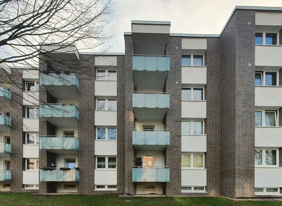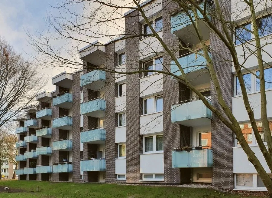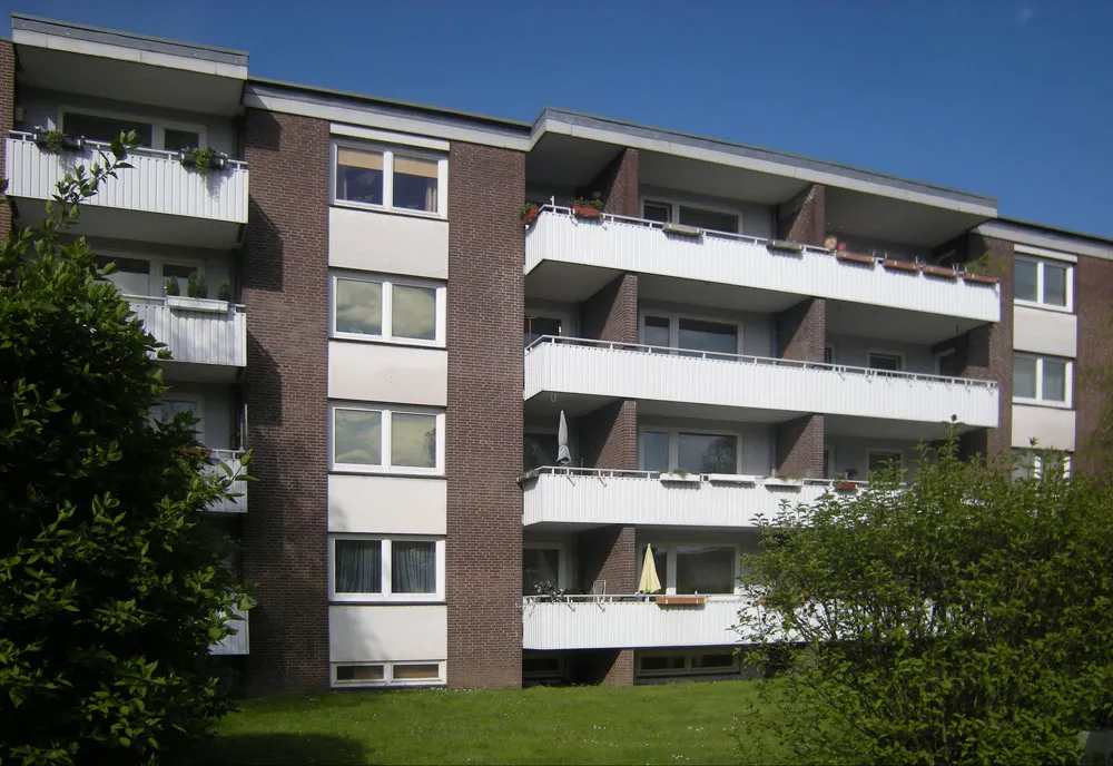 Zu Beginn der 1970er Jahre wurden die beiden 4-geschossigen Wohnblöcke mit insgesamt 5 Hauseingängen in Massivbauweise errichtet. Die Klinkerfassade wird durch weiße Brüstungsfelder in den Fensterachsen und weiße Balkonbrüstungen vertikal unterbrochen. Durch die zusätzliche Staffelung von bauzeitlich typischen Vor-und Rücksprüngen des größeren Wohnblocks entsteht eine dynamische Gebäudeansicht. Die Gebäude wurden als „backstein-relevant" eingestuft (Hamburger Verfahren zum Schutz stadtbildprägender Gebäude). Der Rhythmus der Hell-Dunkel-Kontraste aus Klinker und Putzflächen innerhalb der Fassade wird auch nach der energetischen Sanierung gewahrt.